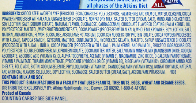 非常に沢山の材料が使われています。 ダーク チョコレート風味コーティング [分別されたやし穀粒オイル、マルチトール、ミルク蛋白質濃縮物、ココア パウダー、大豆レシチン]、分離大豆たん白質、ポリデキスト、グリセリン、 フラクトオリゴ、水、カラメル風味コーティング [マルチトール、パーム核油、全乳固形分、減らさ れたミネラル ホエー、自然と人工の味、ココア粉、脱脂乾燥したミルク、人工の色 (黄色 5 湖、イ エロー 6 湖、青 2 湖)、大豆レシチン、塩、スクラロース]、(アルカリ処理) マルチトール シロ ップ、ココア パウダー、無糖チョコレート、タピオカ澱粉、脱脂乾燥したミルク、自然と人工の味、分別され たやし穀粒オイル、大豆レシチン、塩、ビタミン ミネラル配合 [酸化マグネシウム アスコルビン酸ナトリウム 、アスコルビン酸 (ビタミン C)、DL アルファトコフェロール酢酸 (ビタミン E)、ナイアシンアミド、酸化 亜鉛、D-パントテン酸カルシウム、ビタミン A パルミチン酸, 硝酸チアミン (ビタミン B1)、ピリドキシン 塩酸塩 (ビタミン B6)、リボフラビン (ビタミン B12)、炭酸カルシウム、クエン酸ナトリウム、アセスル ファムカリウム、スクラロース。 ※ピーナッツ、木の実、卵、小麦とごまの種子を使用する施設で製造されています。 添加物など原材料にこだわりのある方の場合、NGになるような材料もありますね。人口着色料など、余り必要性を感じないのでなくせば・・などとも思いますが・・ 市販で沢山販売されているようなお菓子に抵抗のない方なら、多分大丈夫でしょう。