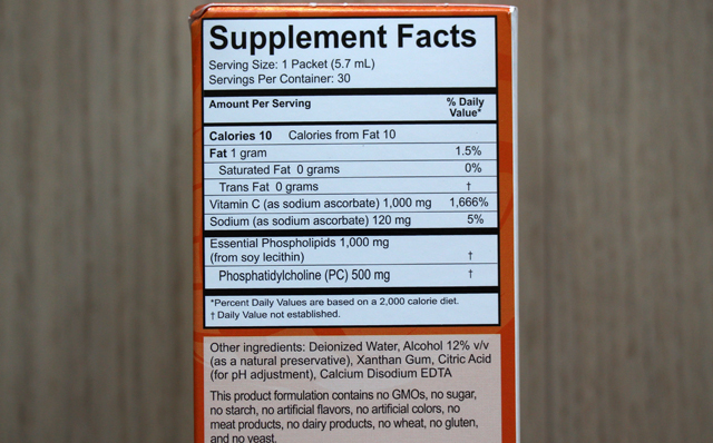 以前と同じで、1パケットに1000mgのビタミンCが含まれています。 成分についてですが、従来製品と比べると、Phosphatidylethanolamine(ホスファチジルエタノールアミン)とPhosphatidylinositol(ホスファチジルイノシトール)という成分がなくなっていますが、他は同じ。 どちらもビタミンCをリポゾーム化するためのリン脂質です。現在は大豆レシチンのみを使用しているよう。 製品が変わったのは、従来製品が成分的に日本に輸入できなくなったからとかそういう理由らしいですが、詳しくはわかりません。供給が切れてしまう前に、代替製品を出してくれて感謝です。