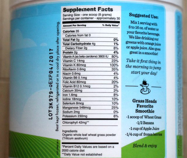 左が今回購入したAmazing GrassのOrganic Wheat Grass、右がいつも飲んでいるGreen Foods CorporationのGreen Magmaです。 Green Magmaはいつも300g入りの物を購入していますが、濃いめに作るので、一日に2~3杯飲むと結構早くになくなってしまいます。 それだけの量を飲む理由ですが、ずっと野菜を絞って作った青汁を飲んでいたので、同じ位濃くないとどうも物足りなく・・ 青汁のようなえぐみのあるものや、苦いものが好きだというわけではないのですが、自分が健康効果を感じられたのが「濃いめの青汁を1一日3杯」だったというわけで、その日の食事の内容によっては2杯にしたりと、都度調整しています。 ちなみに、今回の製品を買うにあたって私が懸念していたのは、味と繊維の含有量。 私の知る限り、グリーンマグマは大麦を一度絞ったものを乾燥させてからパウダーにしているため、食物繊維を含んでいません。食物繊維というと良いもののように思えますが、野菜では繊維が多いと栄養素の吸収が妨げられてしまう恐れがある為、含有量が多いのは一概に良いとは言えません。 私の場合、胃腸が弱いために繊維(不溶性)を多く含む食品を沢山摂ると、おなかの調子が悪くなるか、悪ければ腹痛が起こってしまうため、毎日それなりの量を摂取する食品は繊維を含まないものの方がベスト。(ただし水溶性繊維はOK) 今回購入したOrganic Wheat Grassは多少の繊維を含んでいるため、その辺が心配でした。