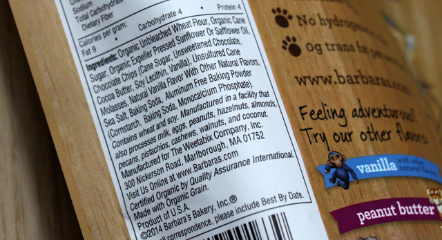 原材料。 有機無漂白小麦粉、有機乾燥サトウキビ糖、有機性エキスペラー ヒマワリまたはサフラワー油、チョコレート チップ (乾燥サトウキビ ジュース、無糖チョコレート、ココアバター、大豆レシチン、バニラ)、unsulphured 乾燥サトウキビ糖蜜、他の自然の味、海の塩、重曹と自然なバニラ味に押された、アルミニウム無料ベーキング パウダー (コーンスターチ、ベーキング ソーダ、第一リン酸カルシウム)。 小麦、大豆が含まれています。また、牛乳、卵、ピーナッツ、ヘーゼル ナッツ、アーモンド、ピーカン ナッツ、ピスタチオ、カシュー ナッツ、クルミとココナッツを処理する施設で製造。 砂糖が体に悪いって言ったら元も子もないですが、天然素材を使用した甘いおやつとしては、まだ体に優しいかなと言う内容です。 少なくとも、人工甘味料とか訳の分からない人工的な素材が使われてはいないため、大人はもちろん子供にも安心。